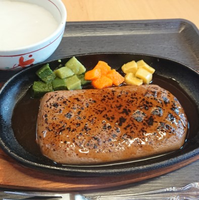 普段はコード1j相当の嚥下食を食べている方なので、看護師にも同席してもらい、ソフティアGで作ったビフテキとワインゼリーを用意。野菜を添えた鉄板にビフテキをのせ、本人の目の前でバーナーを使い焼き上げると「早く食べたい」と食欲も出てきました。
