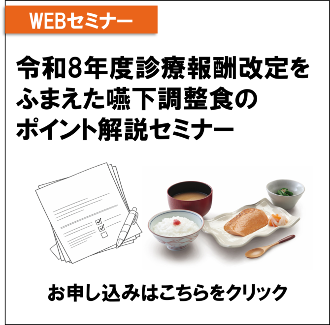 【所要時間】約40分【セミナー内容 】● 診療報酬改定(嚥下調整食 特別食加算関連)のポイント● 「常食と同等の栄養量」を実現 ― 栄養価の改善策 ―● 「適切なテクスチャー」と「常食と同等の盛り付け」を叶える ― きざみ食の改善策 ― など
