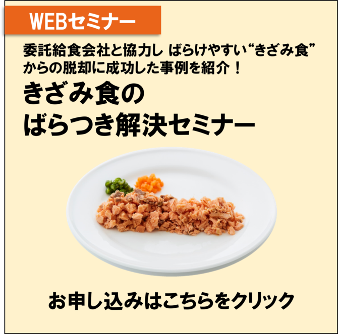【セミナー概要】きざみ食が口の中でばらけてしまい、あんをかけてもまとまりにくそうと感じることはありませんか?改善したいけど厨房の負担が心配という方必見!施設と委託給食会社が連携し、まとまりやすい物性を実現した事例を交え解決策を解説します。