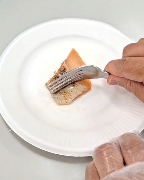 レベル7の容易にかめる(食品)では、フォーク切りテストとフォーク押しテストの2つでかたさを評価します。