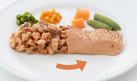 ミキサーに加熱調理した固形状の食材と分量のだし汁、酵素入りゲル化材を入れ、ペースト状にします。
