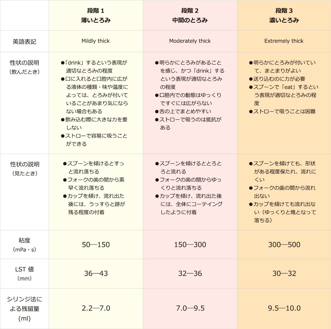 学会分類2021(とろみ)は、薄いとろみ、中間のとろみ、濃いとろみの3段階に分かれています。中間のとろみは、脳卒中後の嚥下障害などでまず試されるとろみの程度を想定しています。薄いとろみは、中間のとろみほどの粘度がなくても誤嚥しないより軽度の嚥下障害を対象にしています。濃いとろみは、重度の嚥下障害が対象です。この3段階に該当しない「薄すぎるとろみ」や「濃すぎるとろみ」は推奨できないとされています。